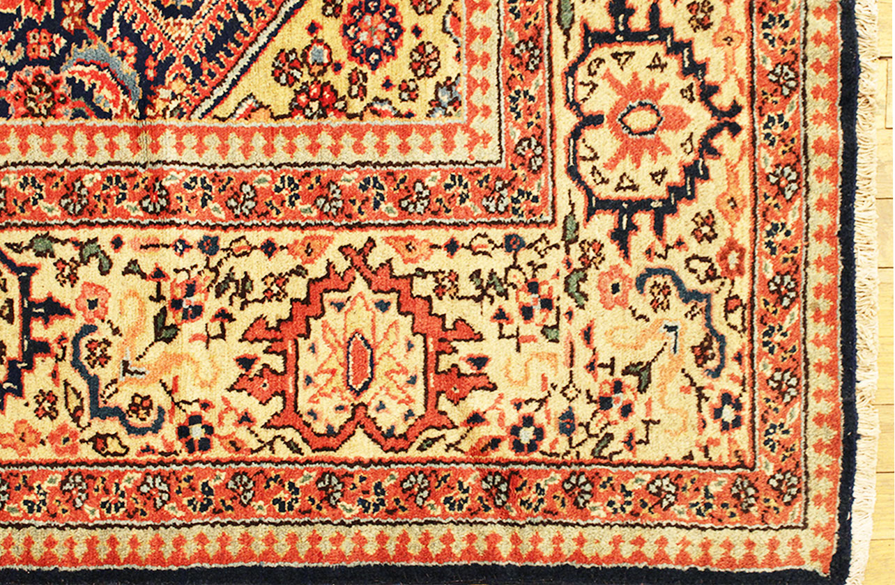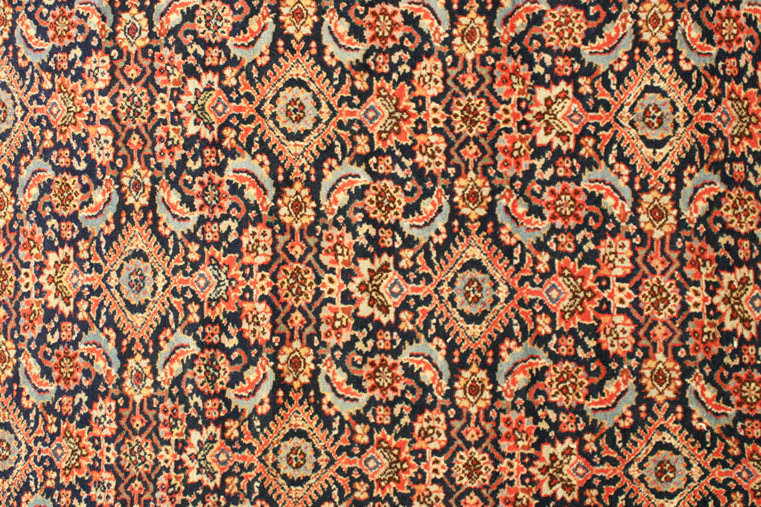 An antique Persian Tabriz oriental carpet, circa 1920. Size: 11'1" x 7'8". This large sized antique decorative rug was handwoven by master weavers in Iran, using high quality wool, with an extraordinarily Fine weave. The carpet is characterized by an elegant herati design allover an inner bed of navy. The finely rendered floral motifs and the herati design is giving this master work an incredibly minute levels of detail, as well as a sweeping overall aesthetic. A masterpiece of design and execution. One of a kind. Excellent condition.