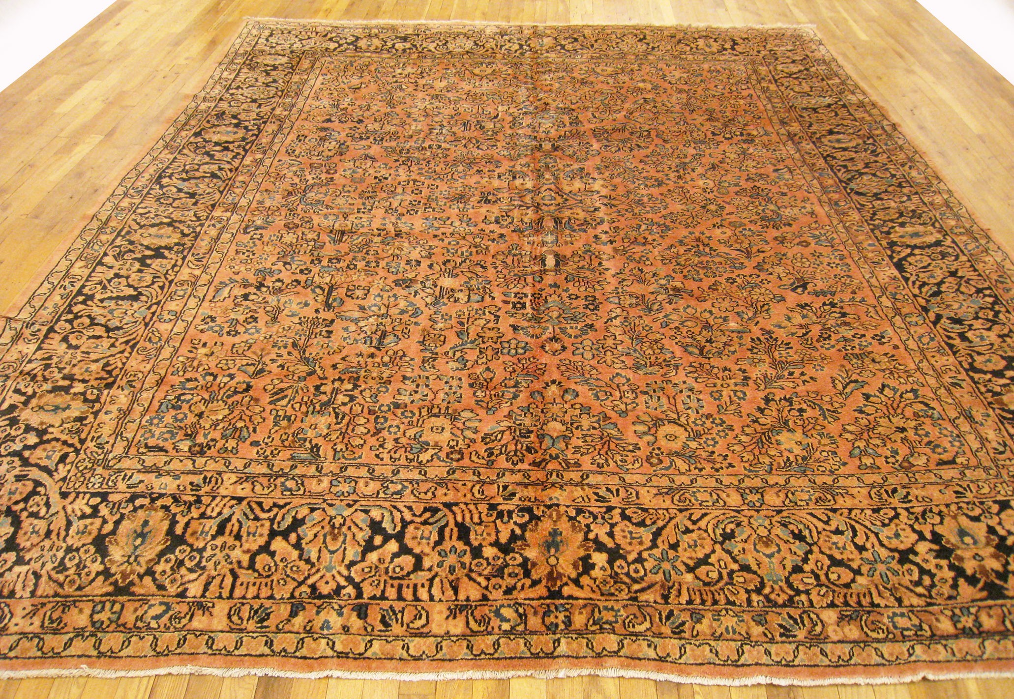 A vintage Persian Sarouk oriental rug, size 11'8" x 9'0", circa 1930. This lovely hand-knotted wool rug features an intricate floral design in the soft coral central field and is enclosed within a blue border. Finely woven, with short wool pile and a soft feel. A great choice for a foyer, an entry way, a short hall, a living space, a bedroom or even as a decorative accent or as wall decor! An instant conversation starter, and an easy way to add color, warmth, charm and sophistication to your home decor. An amazing value!