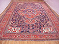 An antique Persian Serapi oriental rug, size 21'0 x 13'4, circa 1910. This handsome hand-knotted wool rug features a central medallion in a blue field at center, with blues, and red tones throughout the rest of the carpet. The central field is enclosed within a complementary outer border. A beautifully balanced rug with soft colors and Classic design, and an excellent addition to your home decor that will instantly bring warmth, color, charm, and sophistication to your interiors. A wonderful choice for a foyer, an entry way, a living space, a bedroom, or as a decorative accent. Can also be used as a wall hanging!