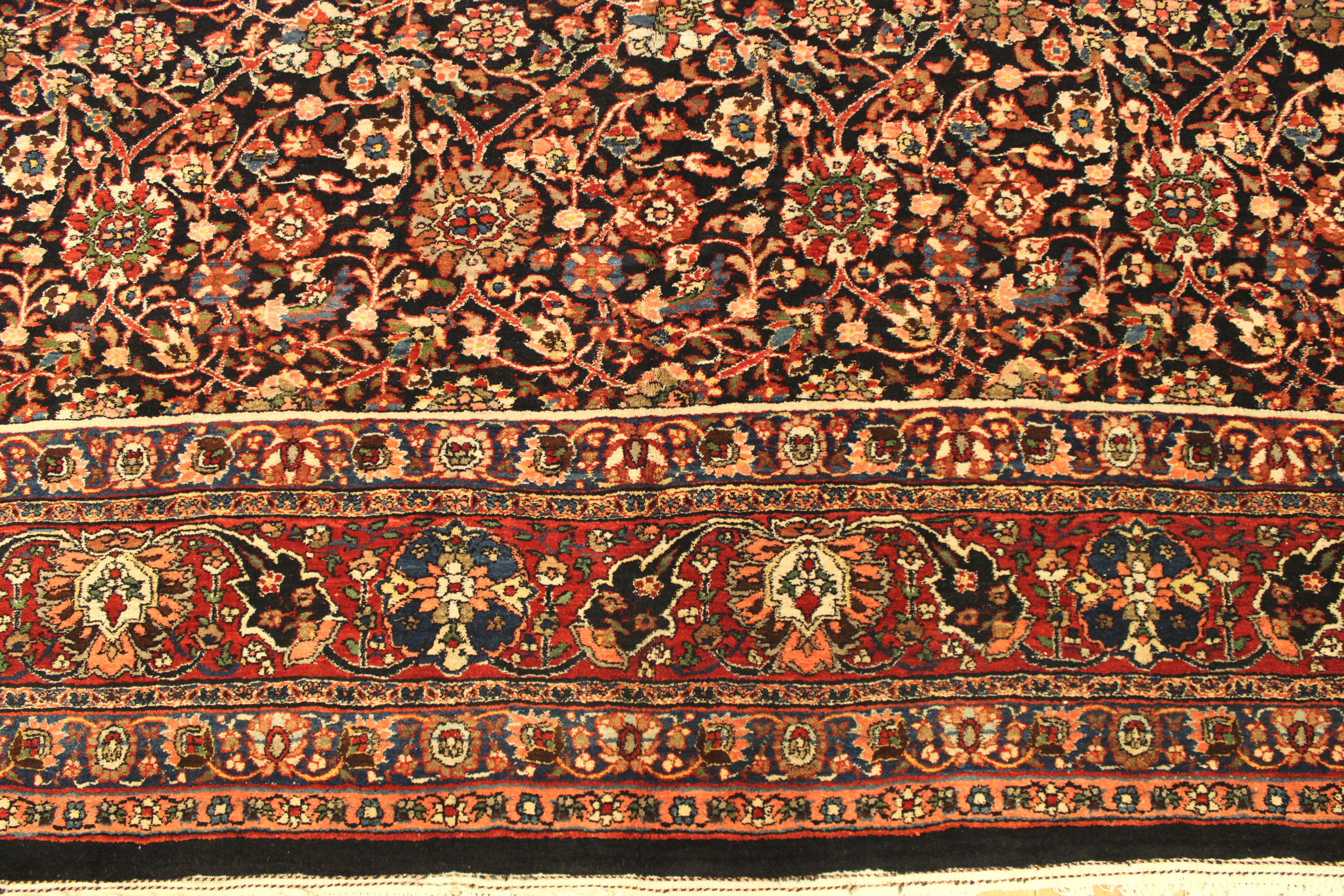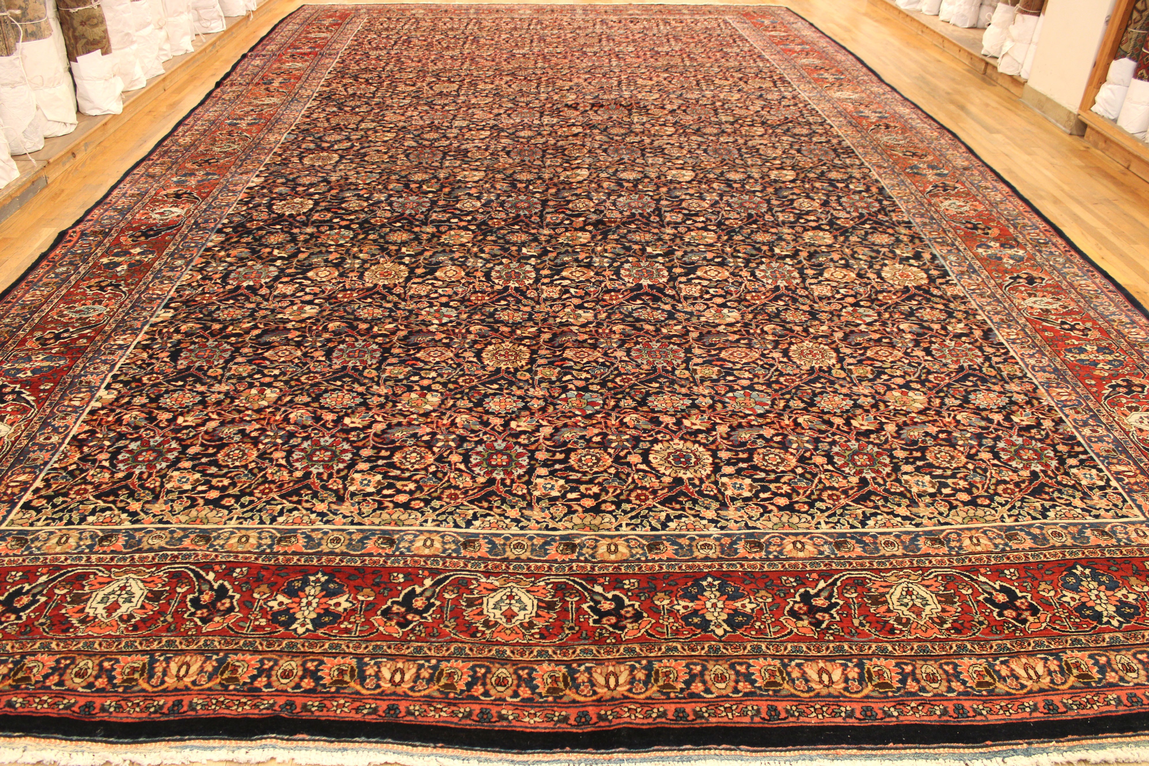 A one-of-a-kind vintage Persian Bidjar Oriental Carpet, hand-knotted with soft wool pile. This beautiful rug features a repeating design, on the blue primary field, with a red outer border. In oversize, size 21'9" x 12'6".