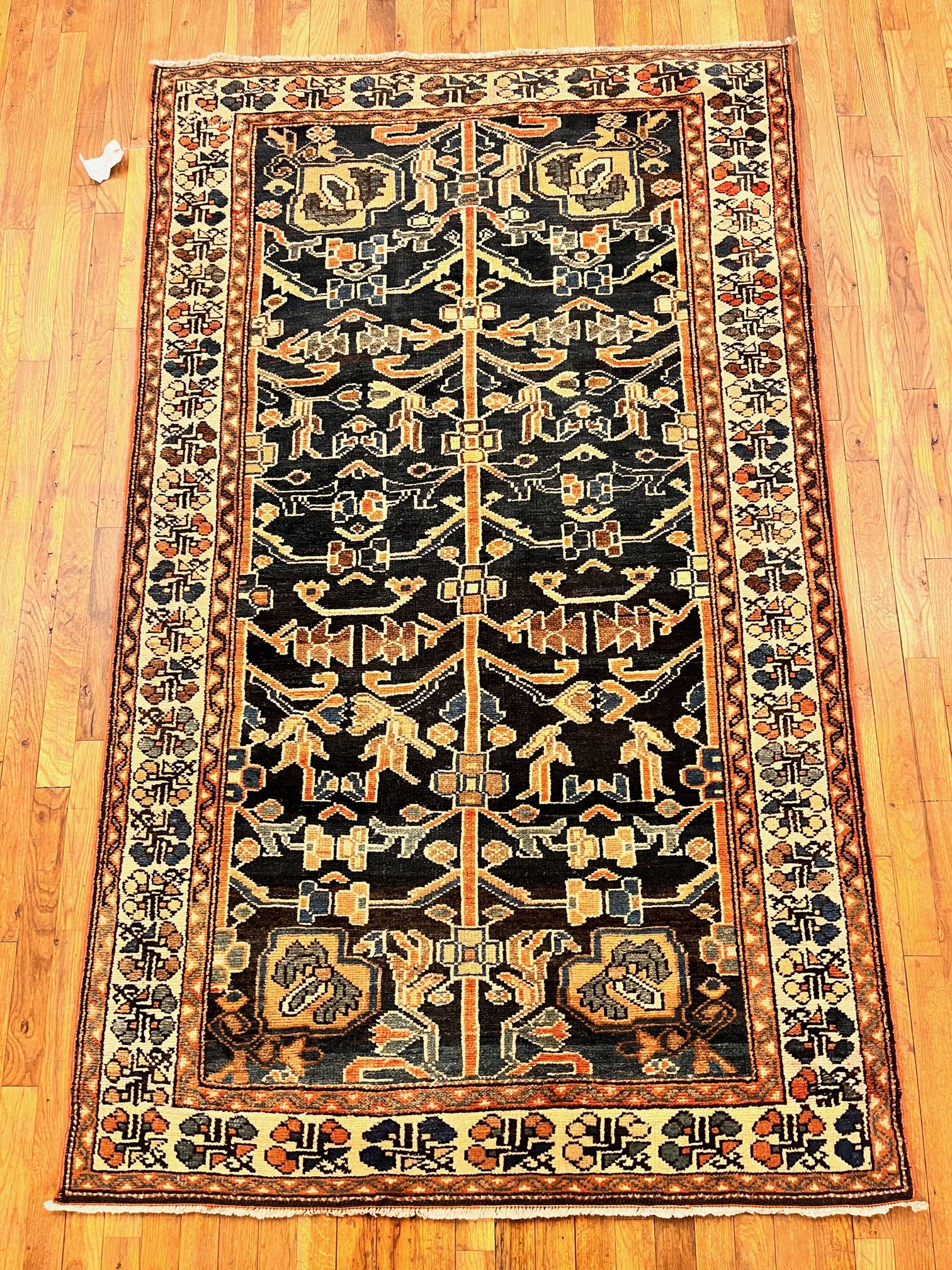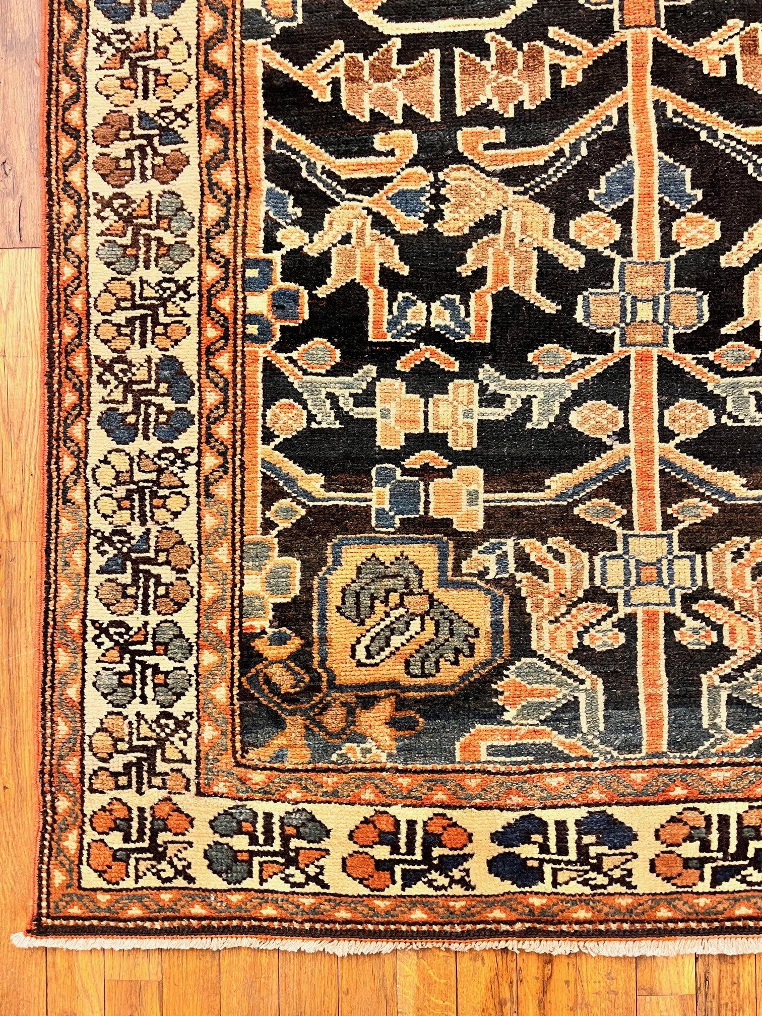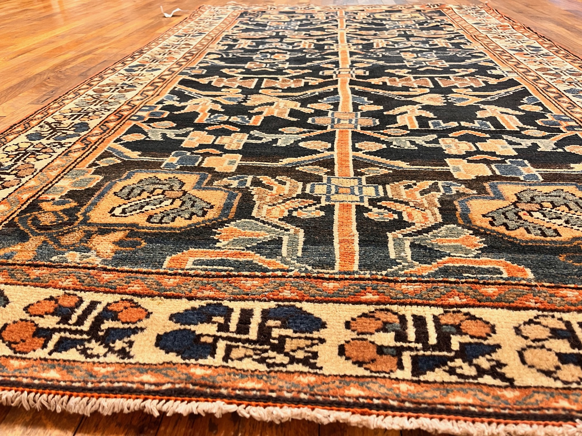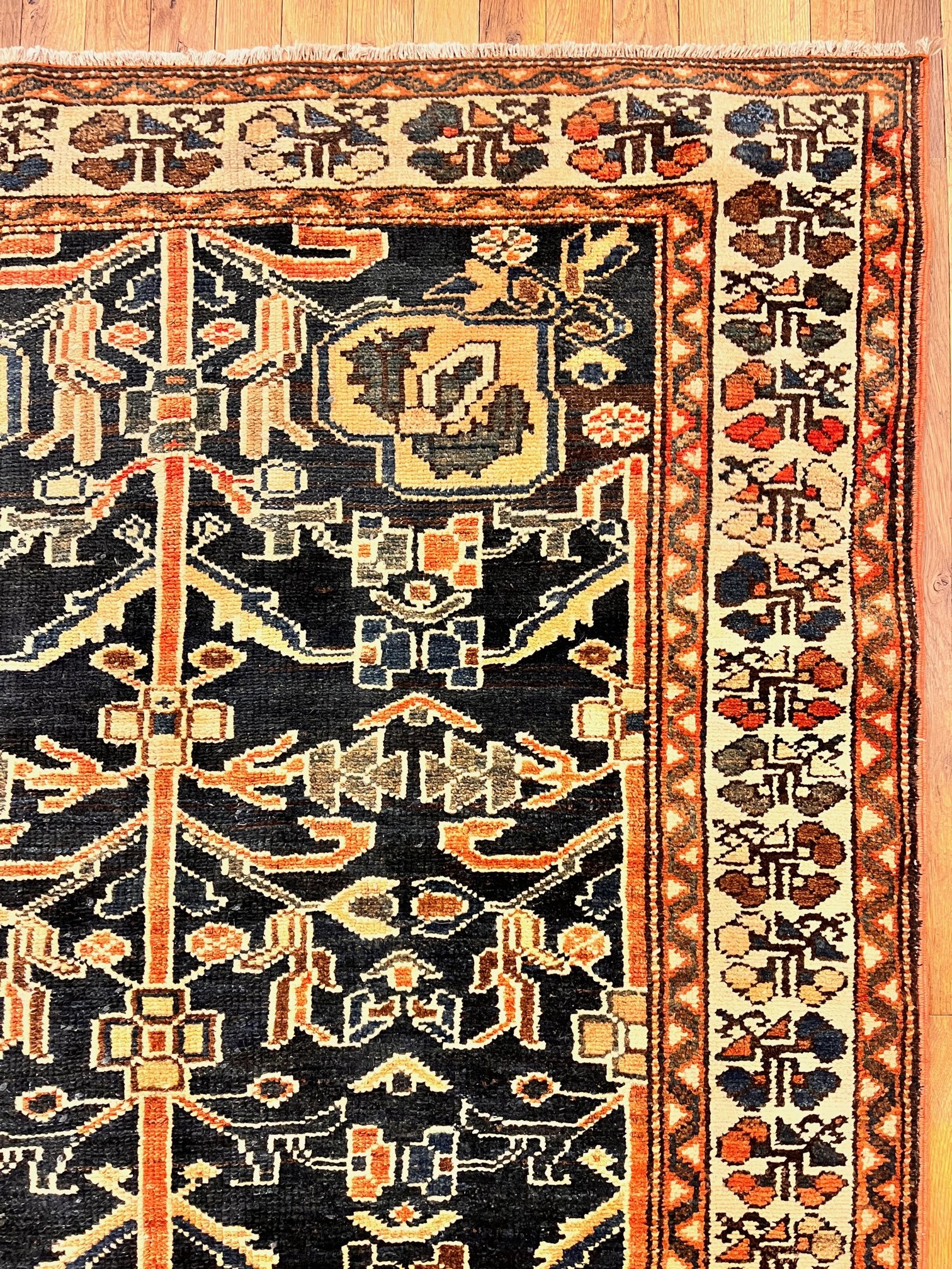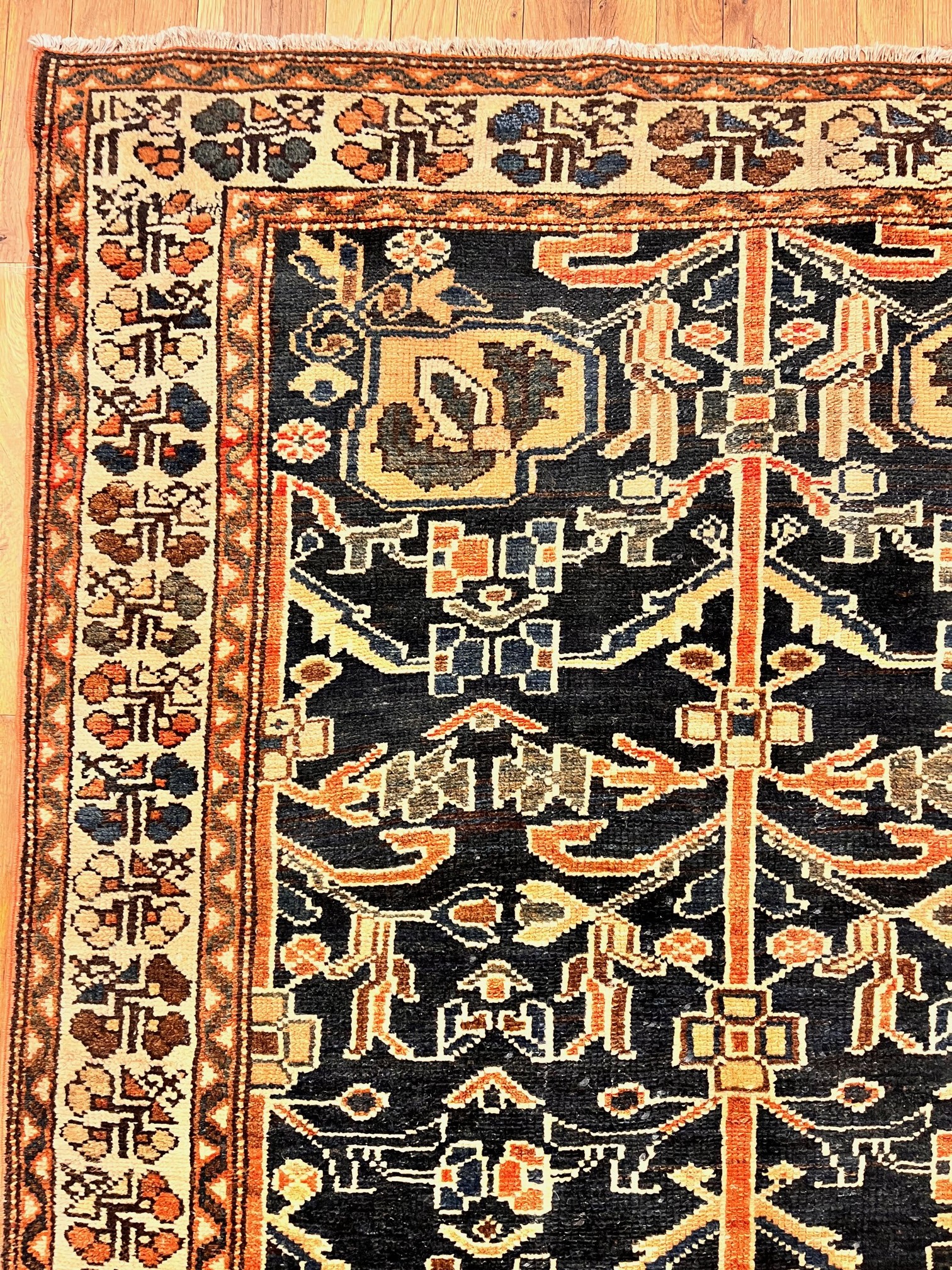 An antique Baktiari oriental rug, size 6'9 x 4'2, circa 1920. This handsome hand-woven geometric rug features a symmetrical design in the blue field. The central field is enclosed within a outer border in ivory tones. The short wool pile is even throughout, and the rug is in excellent condition for its age and weaving style. A great value, and an excellent choice for an entry way, a foyer, a living space, a bedroom, or for use as wall decor or as a decorative accent! Bring this beautiful rug home today.