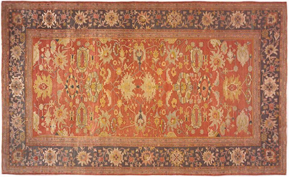 An antique Persian Ziegler Sultanabad oriental carpet, circa 1890, size 20'8 H x 12'4 W. This Classic hand-knotted wool carpet features palmettes allover a soft red primary field. Enclosed within a scrolling foliate gray blue field. Excellent condition, with short wool pile. Ziegler is the finest type of Sultanabad carpet, woven in the famed workshop of Ziegler & Co. before the turn of the 20th century. An amazing addition to your home decor and a statement piece of a lifetime!