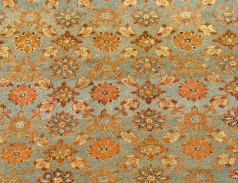 An antique Northwest Persian decorative oriental carpet, in small size, size 6'9" x 5'1".  This hand-knotted antique decorative carpet emanates from Northwestern Persia, in 1900.  The rug is characterized by rosettes allover the blue green central field, which is at once both symmetrical and whimsical; precise and airy.  The central field is encased within a blue green outer border, which adds dimension and definitude to the whimsy of the central space.  In very good condition for its age, weaving style, and composition.  100% wool pile on a cotton foundation.  A one of a kind antique carpet, with a highly sought after and delightful aesthetic.