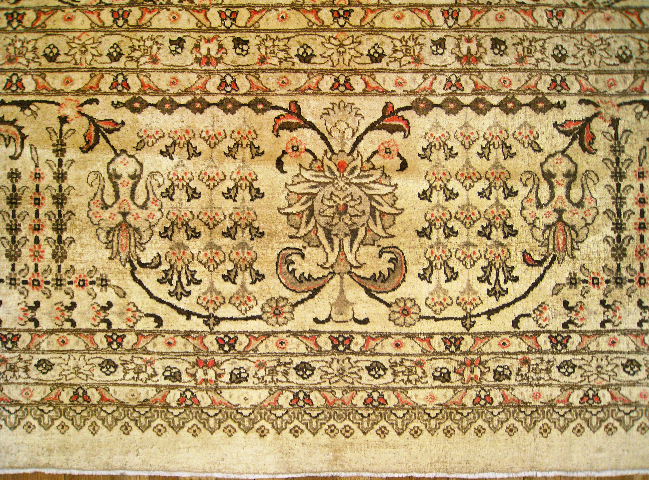 An antique Persian Tabriz oriental carpet, circa 1920. Size: 20'0" x 14'8". This large sized antique decorative rug was handwoven by master weavers in Iran, using high quality wool, with an extraordinarily Fine weave. The carpet is characterized by elegant palmettes allover an inner bed of ivory. The finely rendered floral motifs and the palmettes is giving this master work an incredibly minute levels of detail, as well as a sweeping overall aesthetic. A masterpiece of design and execution. One of a kind. Excellent condition.