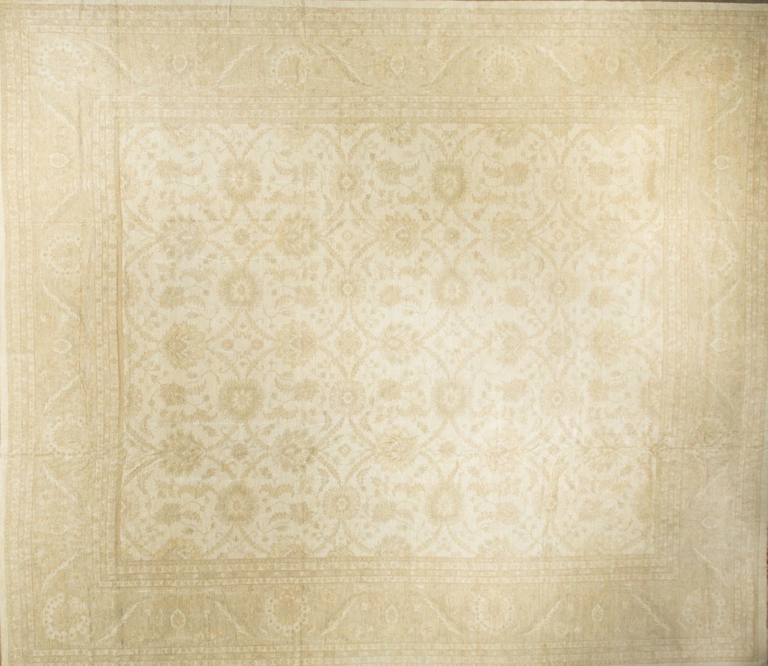 A one-of-a-kind modern Indian Reproduction Sultanabad oriental carpet with a thick and lustrous wool pile, knotted by hand, with soft touch and great resistance to wear. This carpet features floral elements allover a cream primary field, with a gold outer border. In oversize, size 25'4" x 21'1". A wonderful choice for a foyer, an entry way, a living space, a bedroom, or as a decorative accent.